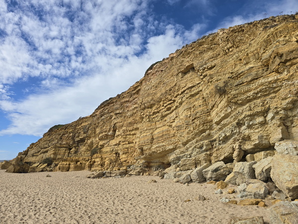 Der lange, breite, Sandstrand wird von leuchtend gelben Klippen