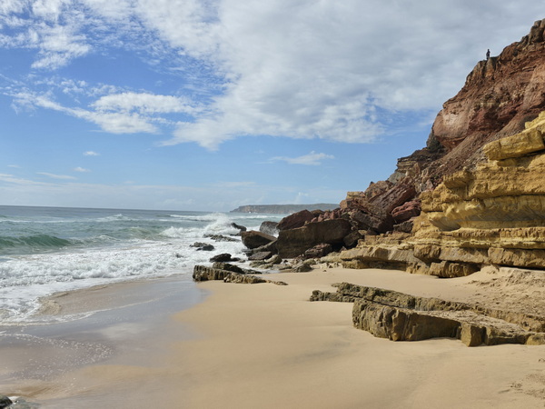 Der lange, breite, Sandstrand wird von leuchtend gelben Klippen